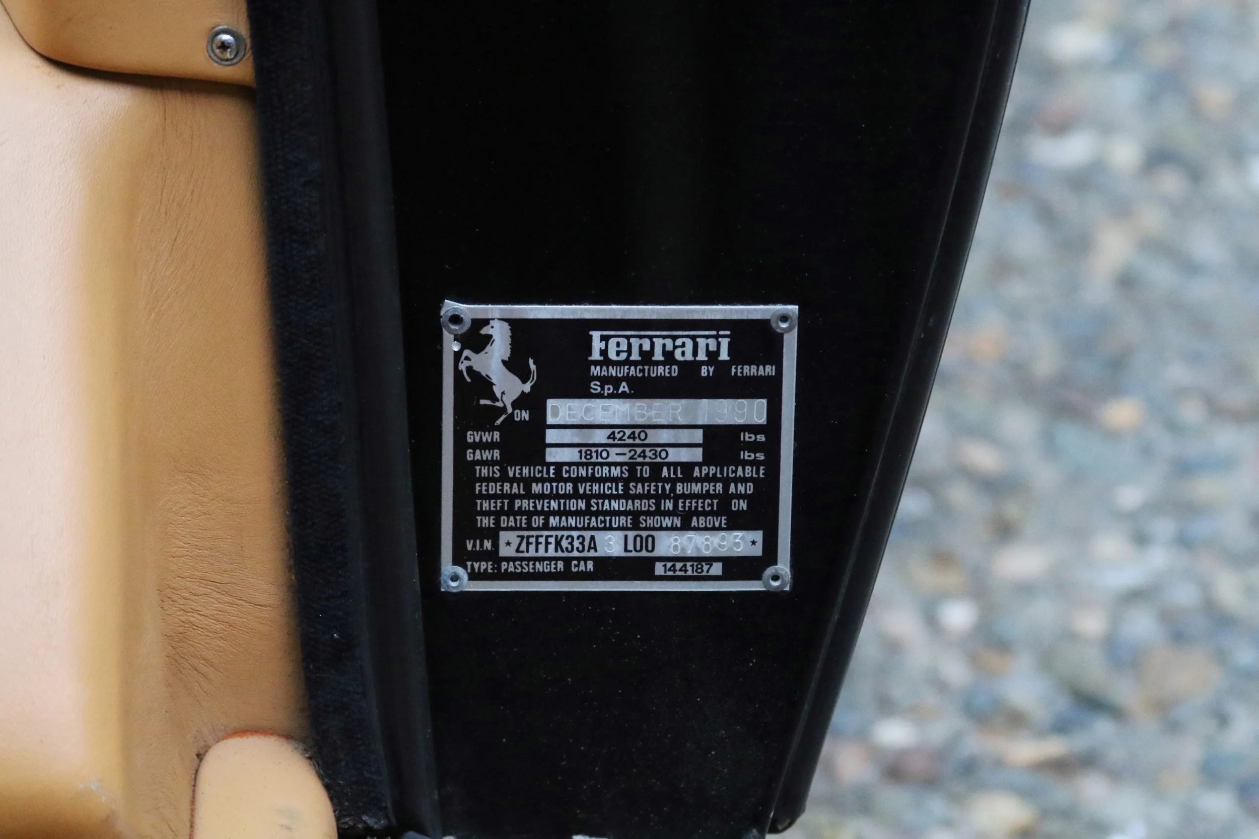 4/12/91 at 0 miles: Sold new to A. Urcioli of Paramas, NY, through NY Ferrari distributor Wide World of Cars